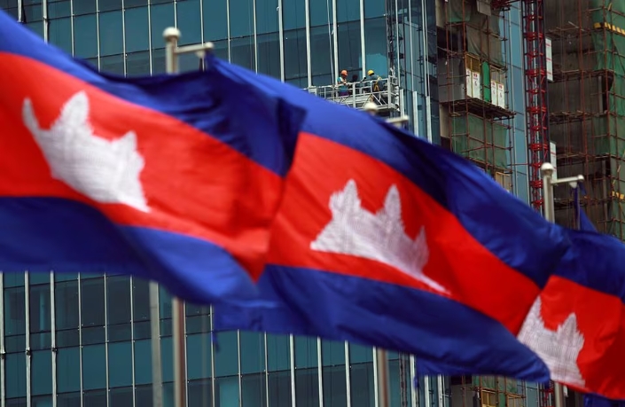 Cambodia's national flags are seen as labourers work at a construction site in Phnom Penh, Cambodia, October 7, 2016. REUTERS/Samrang Pring/File Photo Acqui…