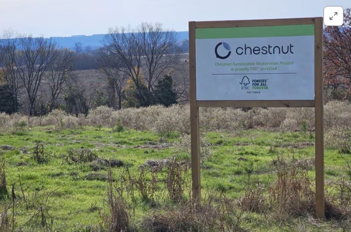 Chestnut signage stands on the company's Arkansas property, U.S., in this undated handout image. Chestnut Carbon/Ana Davila/Handout via REUTERS/File Photo A…
