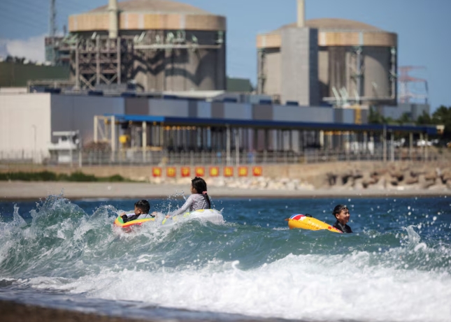 Children play in water as Wolseong Nuclear Power Plant is seen in the background in Gyeongju, South Korea, August 21, 2022. REUTERS/Kim Hong-Ji/File Photo Purch…