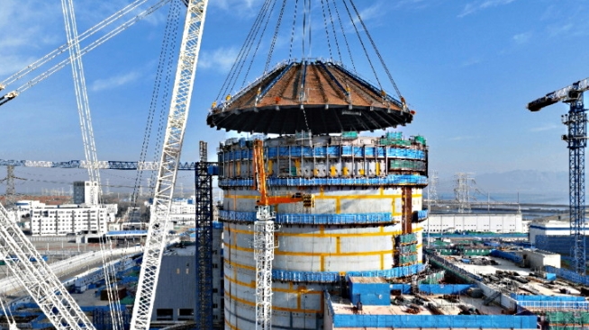 The outer steel dome of the nuclear island containment building of unit 3 at the Haiyang nuclear power plant in China's Shandong province has been hoisted i…