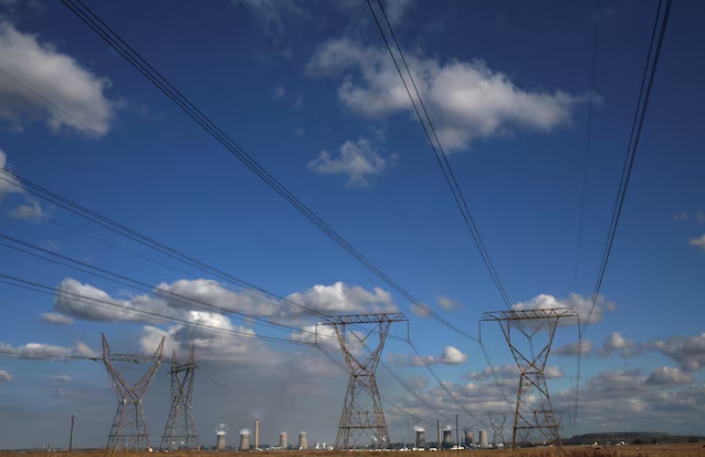 Electricity pylons are seen near cooling towers of South African petrochemical company Sasol's synthetic fuel plant in Secunda, north of Johannesburg, South…