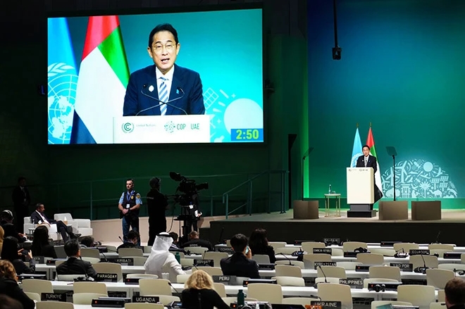 Prime Minister Fumio Kishida delivers an address Dec. 1 during the COP28 U.N. climate conference in Dubai. (Pool)DUBAI--Japan found itself the odd man out at th…