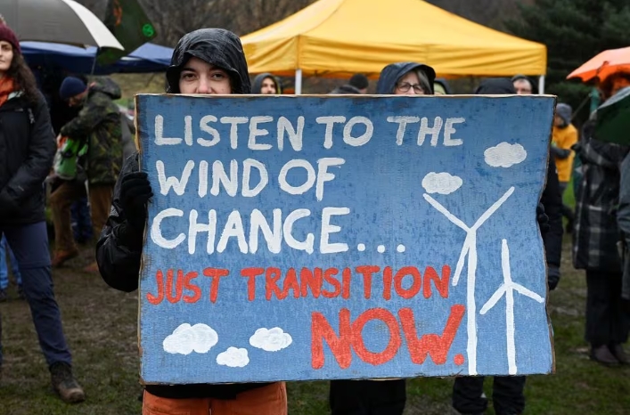 An activist holds a sign, at a protest during the Global Day of Action for Climate Justice, coinciding with COP28, in Edinburgh, Scotland, Britain, December 9, …