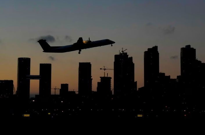 An airplane takes off from Billy Bishop Airport after Canada's Prime Minister Justin Trudeau announced that passengers will require COVID-19 vaccination for…