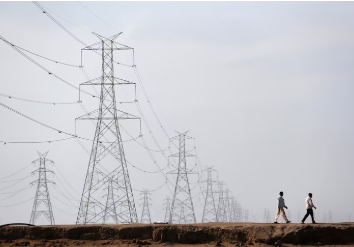 Men walk past electric pylons in Little Rann of Kutch in the western Indian state of Gujarat March 2, 2014.India's electricity generation grew at its slowes…