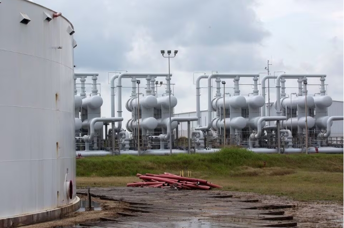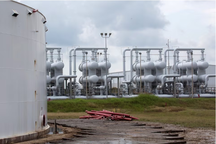 An oil storage tank and crude oil pipeline equipment is seen during a tour by the Department of Energy at the Strategic Petroleum Reserve in Freeport, Texas, U.…