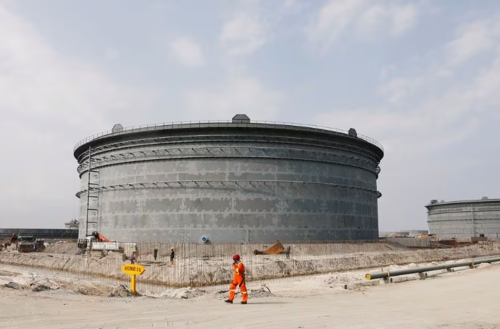 A worker walks past storage tanks at Dangote oil refinery in Ibeju Lekki district, on the outskirts of Lagos, Nigeria August 7, 2019. REUTERS/Temilade Adelaja A…