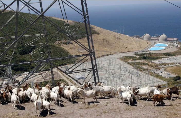 A flock of goats gather under a set of power lines above Diablo Canyon nuclear power plant at Avila Beach, California. June 22, 2005. REUTERS/Phil Klein/File Ph…