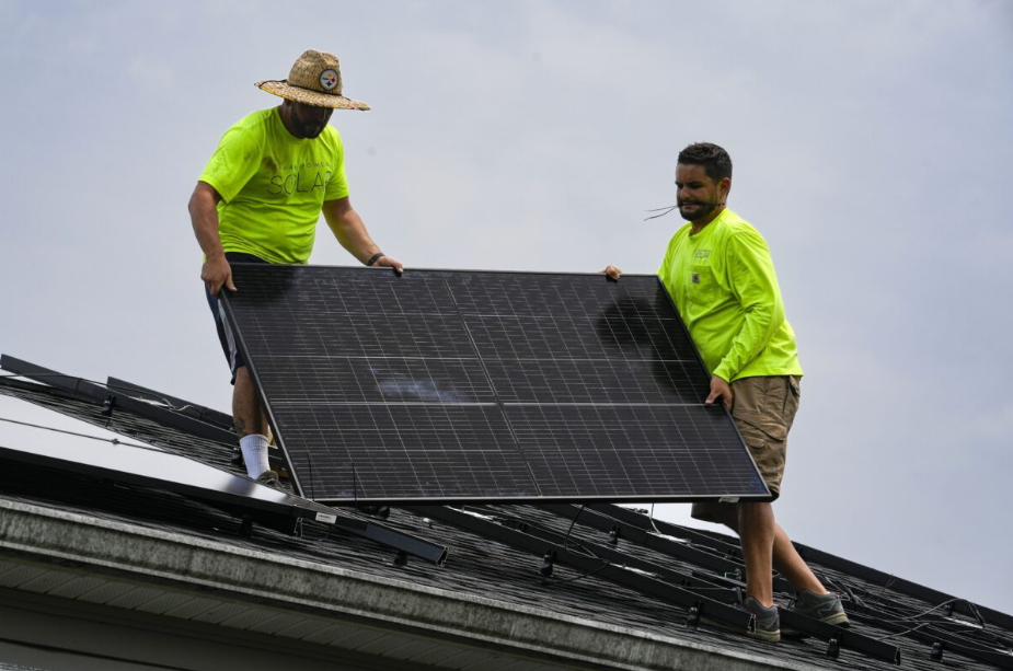 FILE - Even Berrios, left, and Nicholas Hartnett, owner of Pure Power Solar, install a solar panel on the roof of a home in Frankfort, Ky., July 17, 2023. The w…