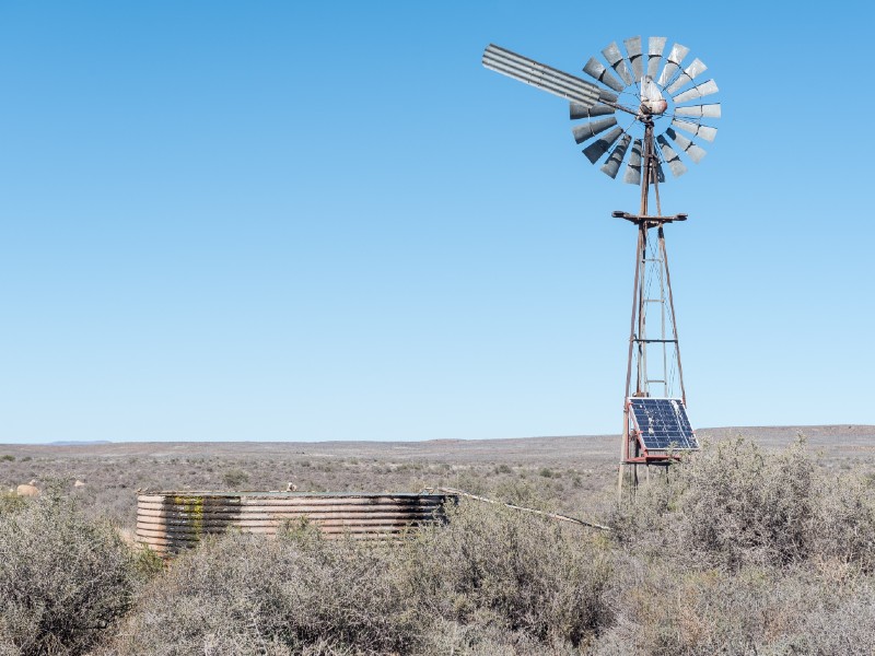 Inactive windmill used as platform for solar panel to pump water into corrugated dam, near Fraserburg in the Northern Cape. Source: dpreezg @123rf.comOff-grid a…
