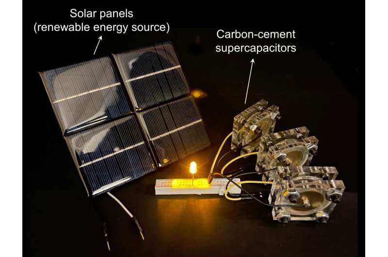 Cement and water, with a small amount of carbon black mixed in, self-assembles into fractal branches of conductive electrodes, turning concrete into an energy-s…