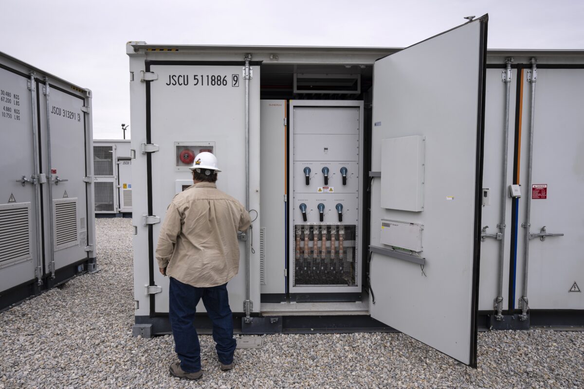 FILE - An employee works at a battery energy storage facility in Saginaw, Texas, April 25, 2023, that is owned and operated by Eolian L.P. The U.S. Department o…