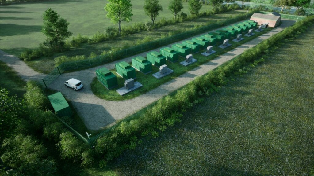 CGI image of the site plan. The 5.7-acre site is well-screened by existing trees and hedgerows, and the battery storage facility will be housed in modular units…