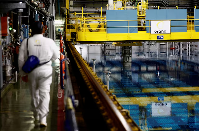 An employee walks near used nuclear fuel in a storage pool at the Orano nuclear waste reprocessing plant in La Hague, near Cherbourg, France, January 17, 2023. …