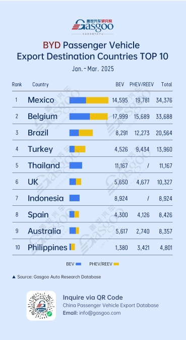 PHEVs Drive New Overseas Surge | Top 10 Destination Countries by BYD’s Passenger Vehicle Exports in Q1 2025