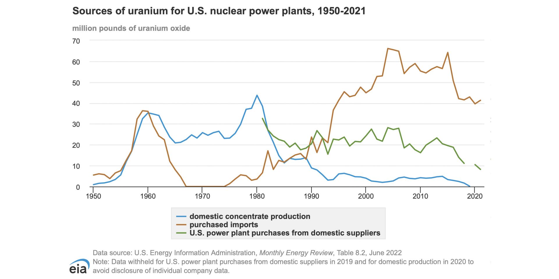 This chart from the EIA shows sources of uranium for U.S. nuclear power plants, 1950-2021. In 2020, according to the chart, 39.60 million pounds of uranium oxid…