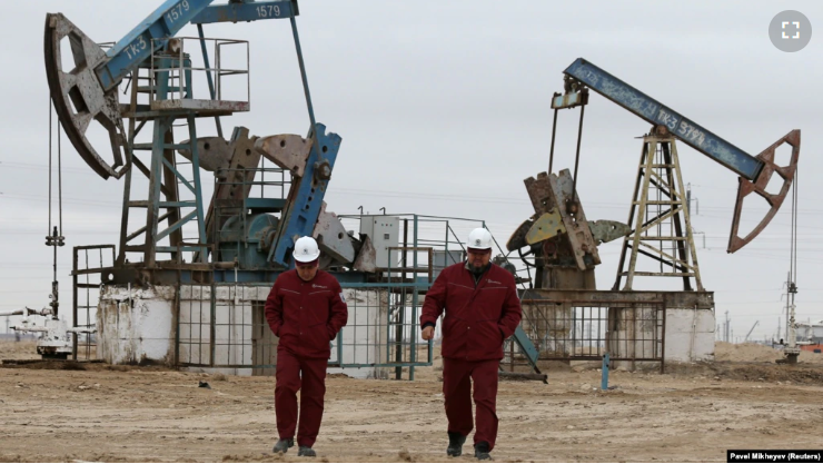 Workers walk near oil pumps at the Uzen oil and gas field in the Mangistau region of Kazakhstan. (file photo)Officials in an eastern Kazakh region say gas expor…