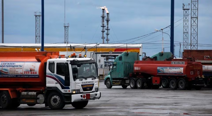 Gasoline tank trucks are seen outside the Rosneft Achinsk oil refinery plant, one of the biggest Siberian fuel suppliers, near the town of Achinsk, some 188 km …