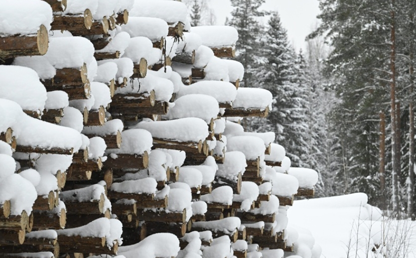 Snow-covered logs in Keuruu in December 2023. A drop in logging volumes had a positive impact on greenhouse emissions in Finland in 2024, according to an analys…
