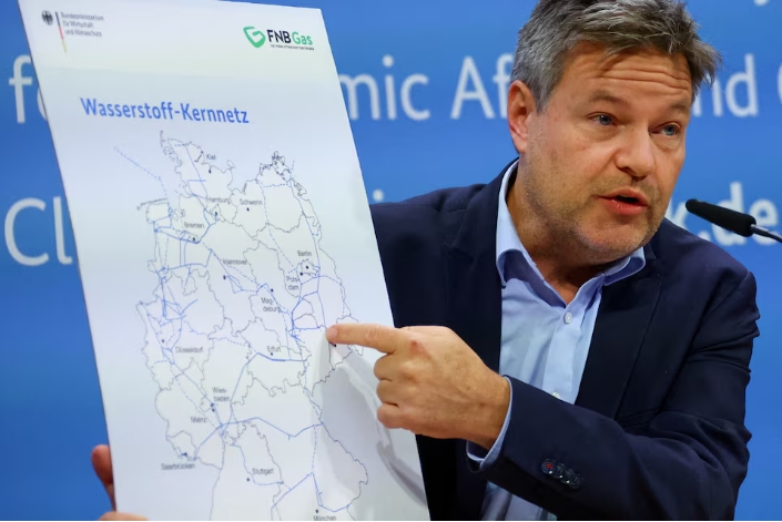 German Economy and Climate Minister Robert Habeck points at a map showing Germany's hydrogen network as he sits next to Chairman of the Board of the Associa…