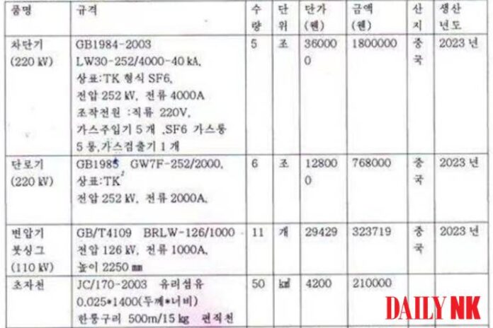 Part of an import contract acquired by Daily NK for power generating equipment between the China-North Korea Hydroelectric Power Company and a Chinese exporter.…