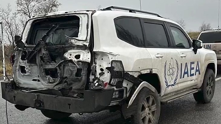 An International Atomic Energy Agency vehicle was hit and damaged by a drone on the day of the latest rotation of the agency's team of experts at the Zapori…