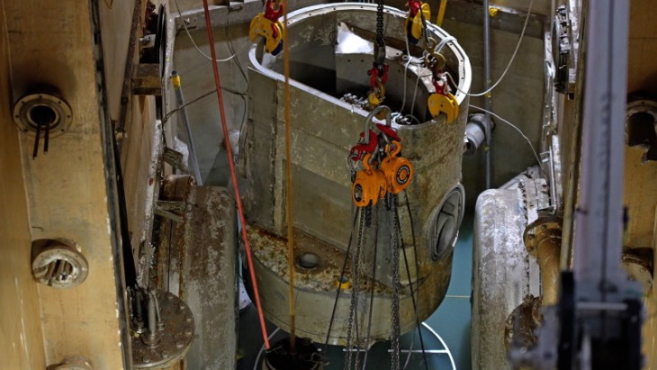 The lower section of the reactor vessel of the Oak Ridge Research Reactor has been removed and transferred to a cask for eventual shipment and disposal. The rea…
