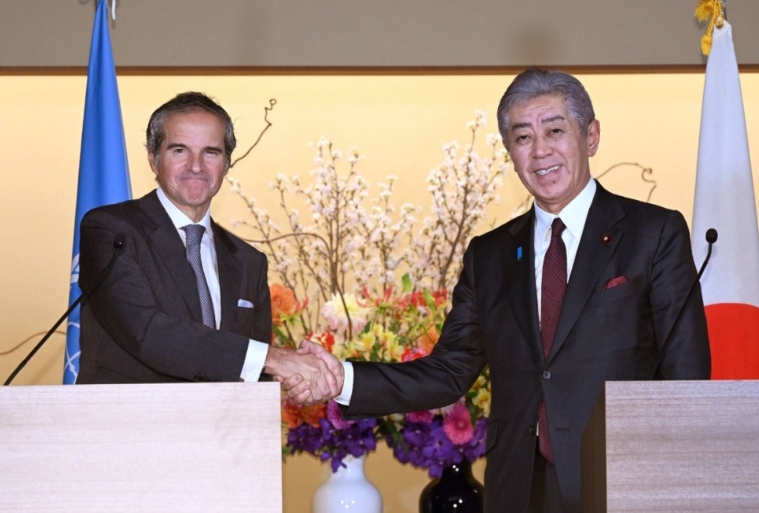 Rafael Grossi (left), director-general of the International Atomic Energy Agency, and Foreign Minister Takeshi Iwaya at a joint news conference in Tokyo on Tues…