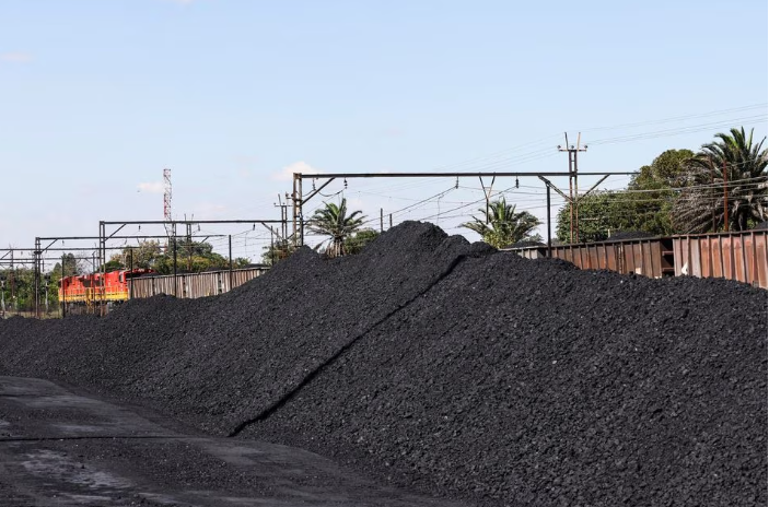 A Transnet Freight Rail train is seen next to tons of coal mined from the nearby Khanye Colliery mine, at the Bronkhorstspruit station, in Bronkhorstspruit, aro…