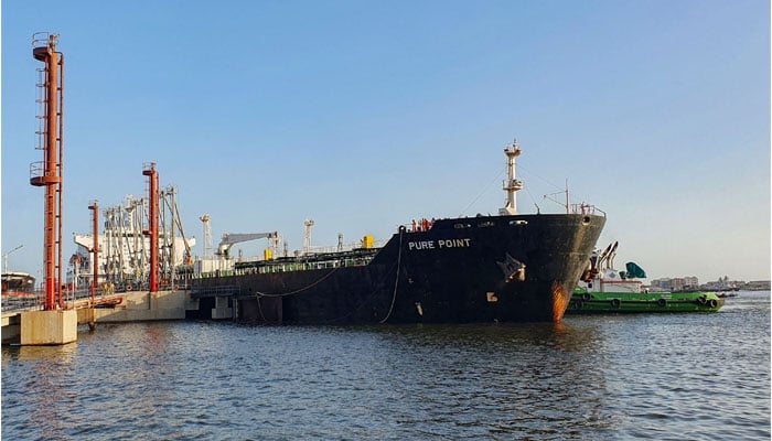 This handout photograph taken on June 11, 2023 and released by the Karachi Port Trust (KPT) shows a Russian cargo ship carrying crude oil at the port in Karachi…