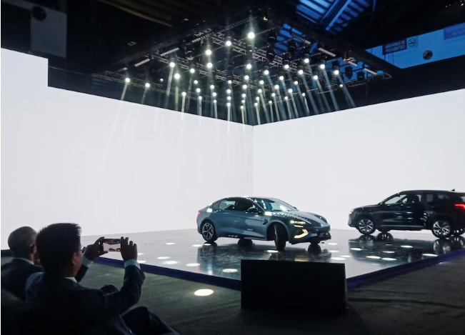 An attendee takes photos of the Chinese electric vehicle BYD models on display, during an event to announce the plans to open a car production plant in Pakistan…