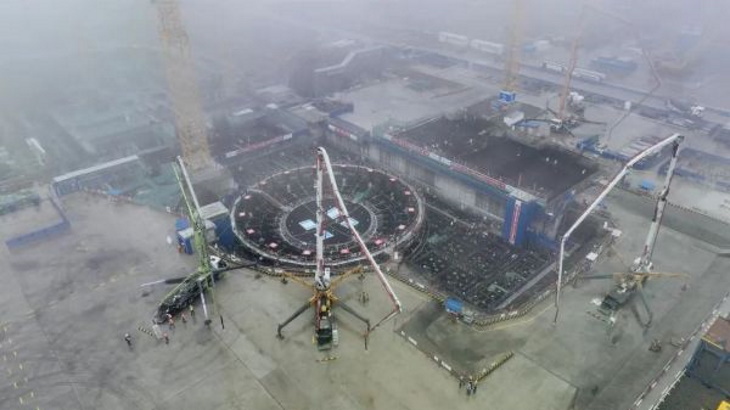 The outer steel dome of the nuclear island containment building of unit 3 at the Haiyang nuclear power plant in China's Shandong province has been hoisted i…