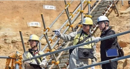 Akira Ishiwatari (right), a commissioner for the Nuclear Regulation Authority, inspects a trench at the Tsuruga nuclear power plant’s No. 2 reactor in Fuk…