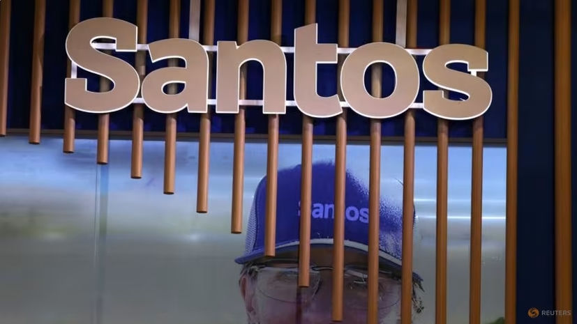 FILE PHOTO: The logo of Australian oil and gas exploration and production company Santos is displayed during the LNG 2023 energy trade show in Vancouver, Britis…