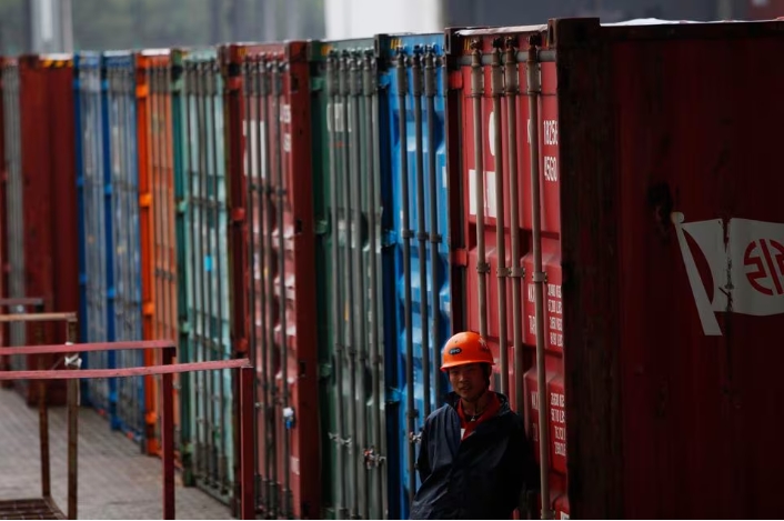 A worker stands next to a shipping container area in Shanghai Yangshan port December 7, 2011.REUTERS/Aly Song/File Photo Acquire Licensing Rights, opens new tab…