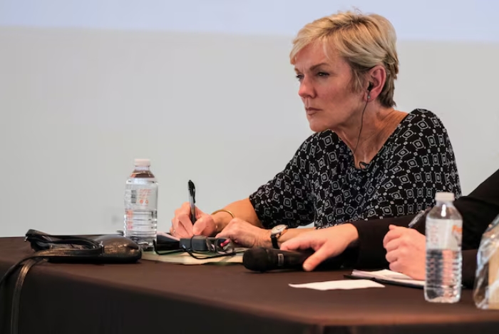 U.S. Secretary of Energy Jennifer Granholm listens to questions from the audience during the PR100 event in Orocovis, Puerto Rico, March 28, 2023. REUTERS/Gabri…
