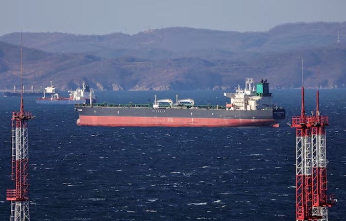 Fuga Bluemarine crude oil tanker lies at anchor near the terminal Kozmino in Nakhodka Bay near the port city of Nakhodka, Russia, December 4, 2022. REUTERS/Tati…