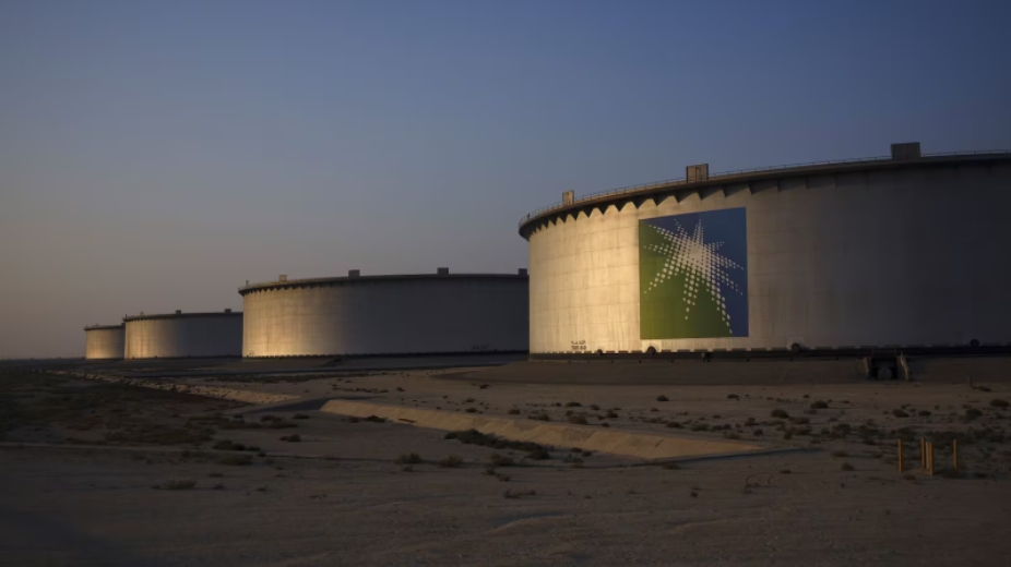 A company logo sits on the side of a crude oil storage tank at the Juaymah tank farm at Saudi Aramco's Ras Tanura oil refinery and oil terminal in Ras Tanur…