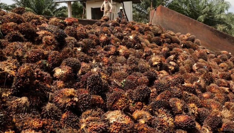 Workers handle palm oil fruits at an oil palm plantation in Slim River, Malaysia August 12, 2021.Malaysia has no plans to raise palm oil's biodiesel blend t…