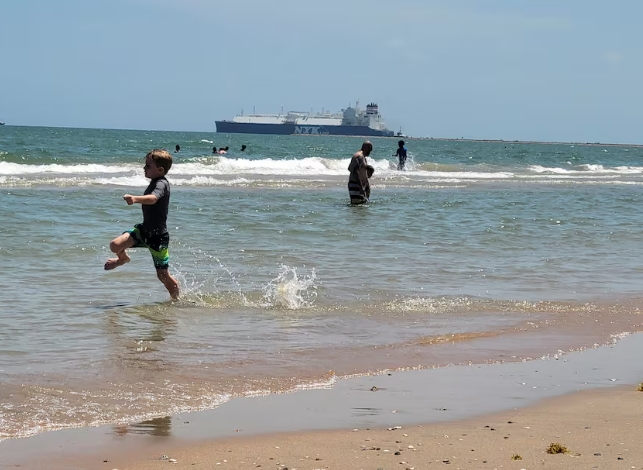 A child plays at Surfside Beach as France-flagged vessel LNG Adventure departs from Freeport, Texas, bound for the Panama Canal, in Freeport, Texas, U.S. July 2…