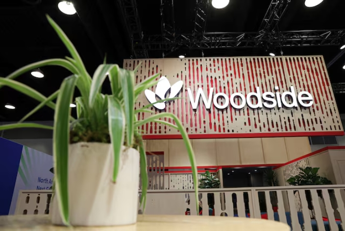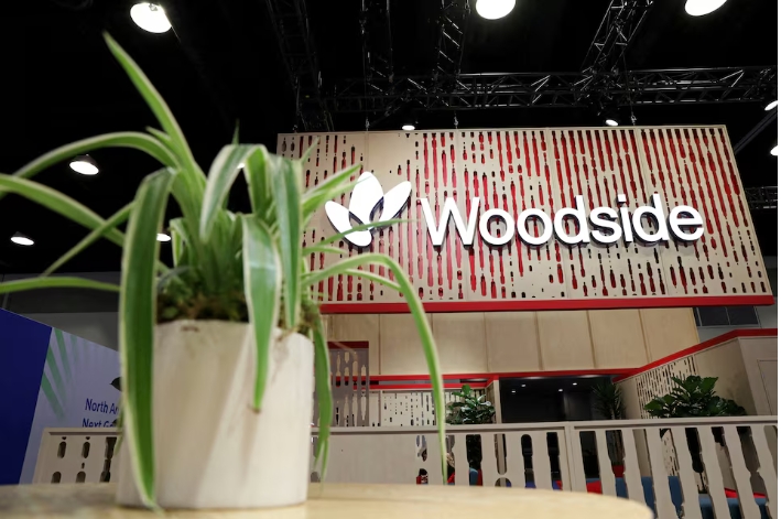 A plant decorates the booth of Australian petroleum exploration and production company Woodside EnergyAustralia's top energy firm Woodside (WDS.AX), margina…