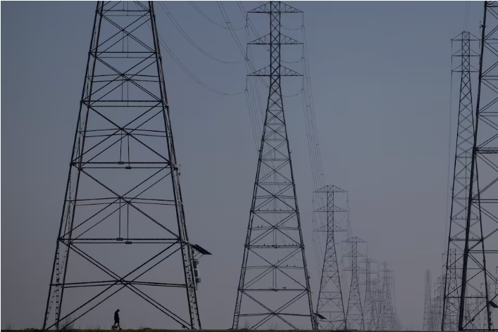 A local resident walks by the power grid towers at Bair Island State Marine Park in Redwood City, California, United States, January 26, 2022. REUTERS/Carlos Ba…