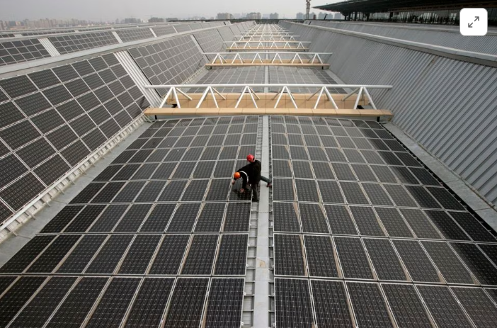 Workers work on a set of solar panels on the rooftop of the Nanjing South Railway Station Nanjing, Jiangsu province March 23, 2011. REUTERS/Sean Yong/File photo…
