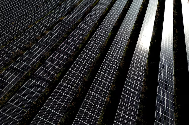 Solar panels are seen at the Keele University Low Carbon Energy Generation Park, Keele, Britain, September 21, 2023. REUTERS/Carl Recine/File Photo Purchase Lic…