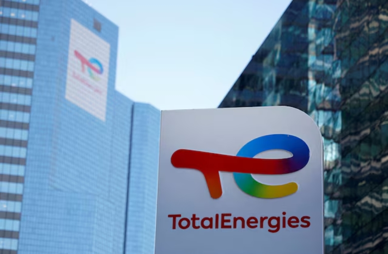 A logo of TotalEnergies is seen at an electric vehicle fuelling station in the La Defense business district in Courbevoie near Paris, France, February 8, 2023. …