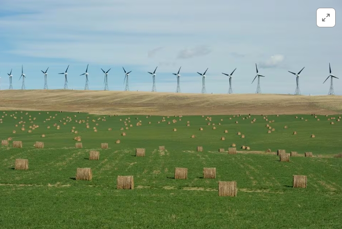 A wind farm generates electricity near bales of hay in the foothills of the Rocky Mountains near the town of Pincher Creek, Alberta September 27, 2010. REUTERS/…