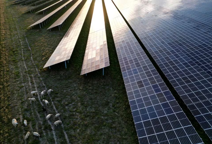 Sheep graze next to solar panels of Germany's largest solar park Weesow-Willmersdorf by energy supplier EnBW AG during sunset in Werneuchen, Germany Septemb…