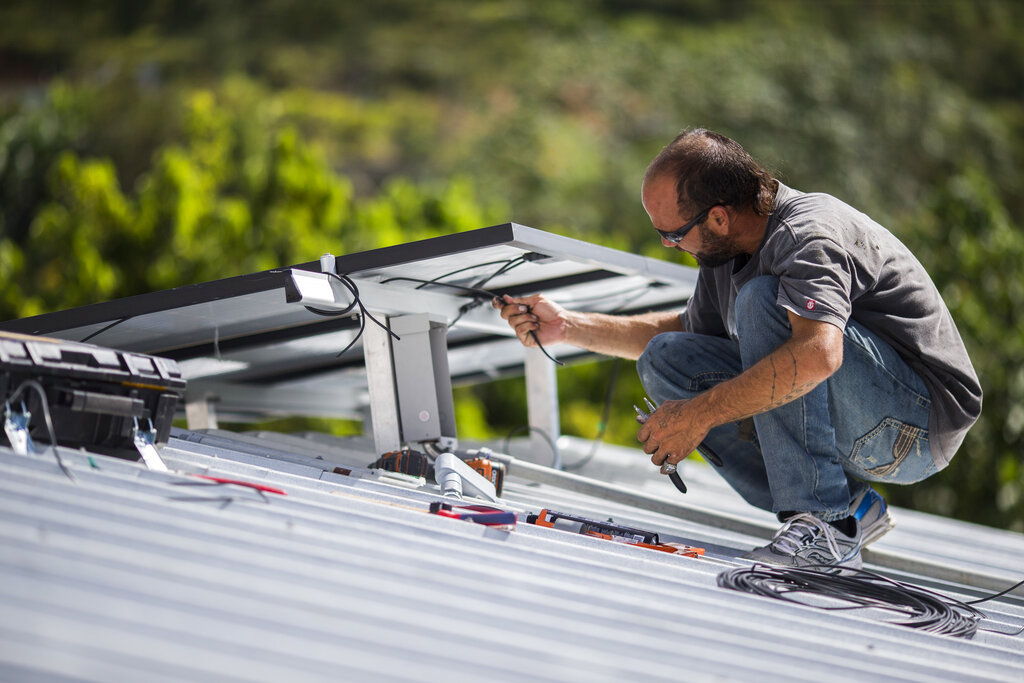 FILE - A technician installs a solar energy system at a home July 24, 2018, in Adjuntas, Puerto Rico. A U.S. government ongoing study that released preliminary …