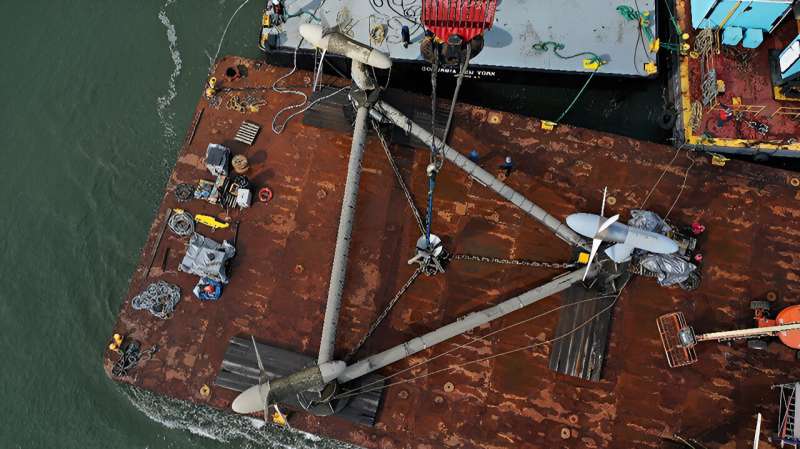 On a gray, foggy day in May 2021, a rust-kissed barge carried three shed-sized tidal turbines—each mounted on the points of a triangular steel frame—through N…