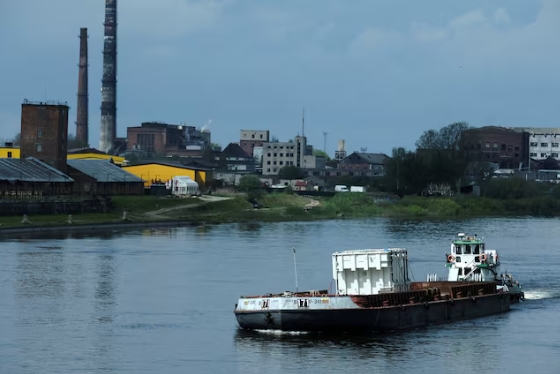 A barge with autotransformer intended for the expansion of the Lithuanian-Polish electricity system connection LitPol Link, moves past the Russian town of Sovet…